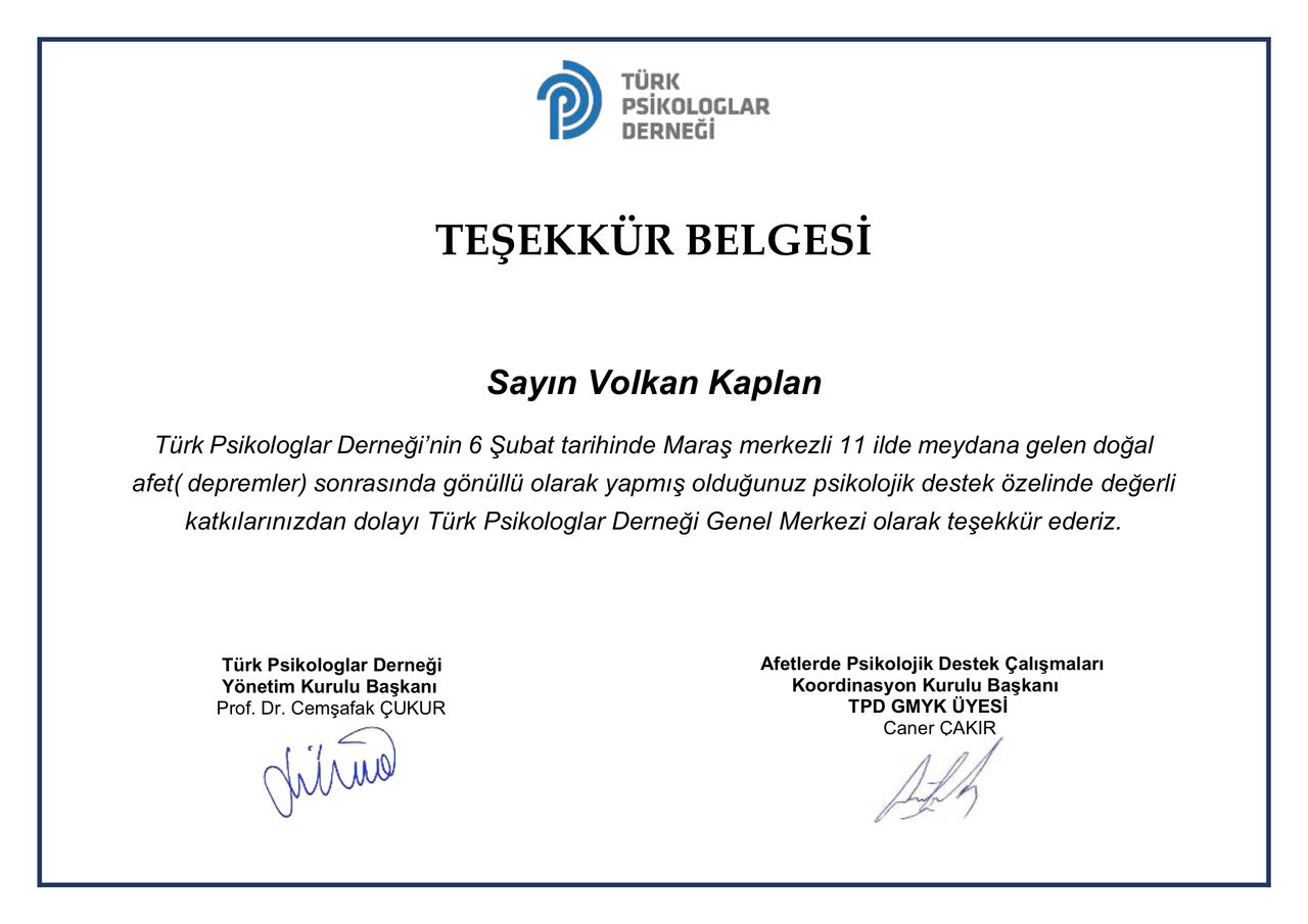Volkan Kaplan, lisans eğitimini Yeditepe Üniversitesi Antropoloji ve Psikoloji bölümlerinden çift anadal programı ile tamamlamıştır. Yüksek lisans eğitimini, Üsküdar Üniversitesi Bağımlılık Danışmanlığı ve Rehabilitasyonu programını tamamlayarak uzman psikolog ünvanı almaya hak kazanmıştır. Bitirme projesi “Travma Sonrası Stres Bozukluğu ve Alkol Kullanım Bozukluğu Eş Tanı İlişkisi” konusu üzerinedir. Kaplan, yüksek lisans eğitim sürecinde NP Beyin Hastanesi AMATEM biriminde stajını tamamlamıştır. 2019 yılından bu yana profesyonel olarak; yetişkin danışanları ile yüz yüze ve online psikolojik danışmanlık süreci yürütürken, toplumu derinden etkileyen süreçlerde görev almakta olup, en son gönüllü faliyetini 6 Şubat depremlerinden etkilenen Gaziantepe/Nurdağı ilçesinde bir hafta süresince gerçekleştirmiştir. Uzmanlık alanını nitelikli kılmak adına İşyeri Psikolojisi eğitimi, SAMBA (Sigara, Alkol ve Madde Bağımlılığı Tedavi Programı) eğitimi, Bağımlılıkta Şema Terapi eğitimi ve Prof. Dr. Ebru Şalcıoğlu tarafından verilen, Bilişsel Davranışçı Terapi eğitimlerini tamamlamış olup, seanslarında Bilişsel Davranışçı Terapi ekolünden faydalanmaktadır.